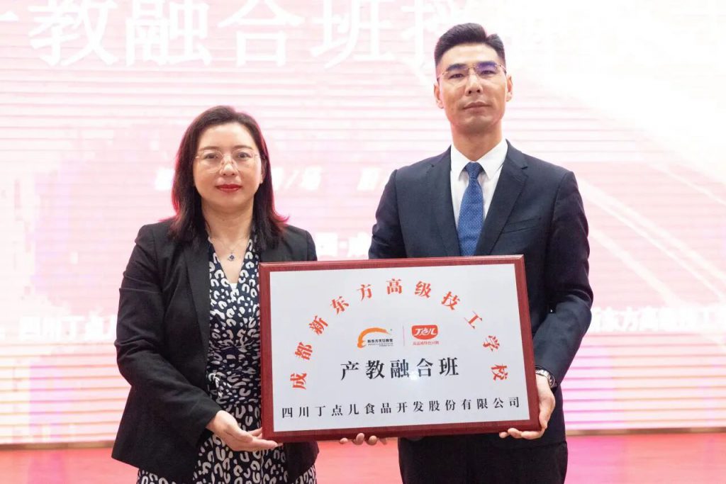開幕式上,成都新東方高級技工學(xué)校黨支部書記趙遠(yuǎn)與丁點(diǎn)兒食品市場總監(jiān)屈詠梅共同完成“丁點(diǎn)兒產(chǎn)教融合班”授牌儀式,標(biāo)志著雙方在川菜教育領(lǐng)域的深度合作邁入新的篇章。
